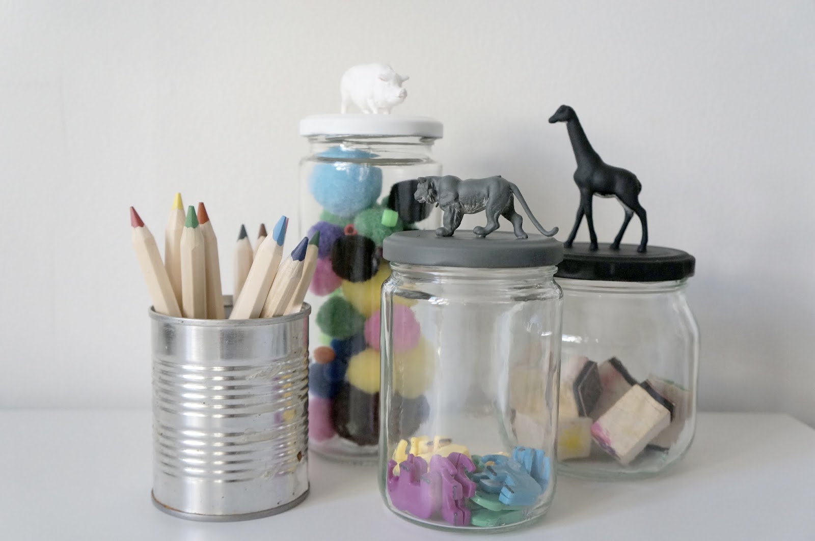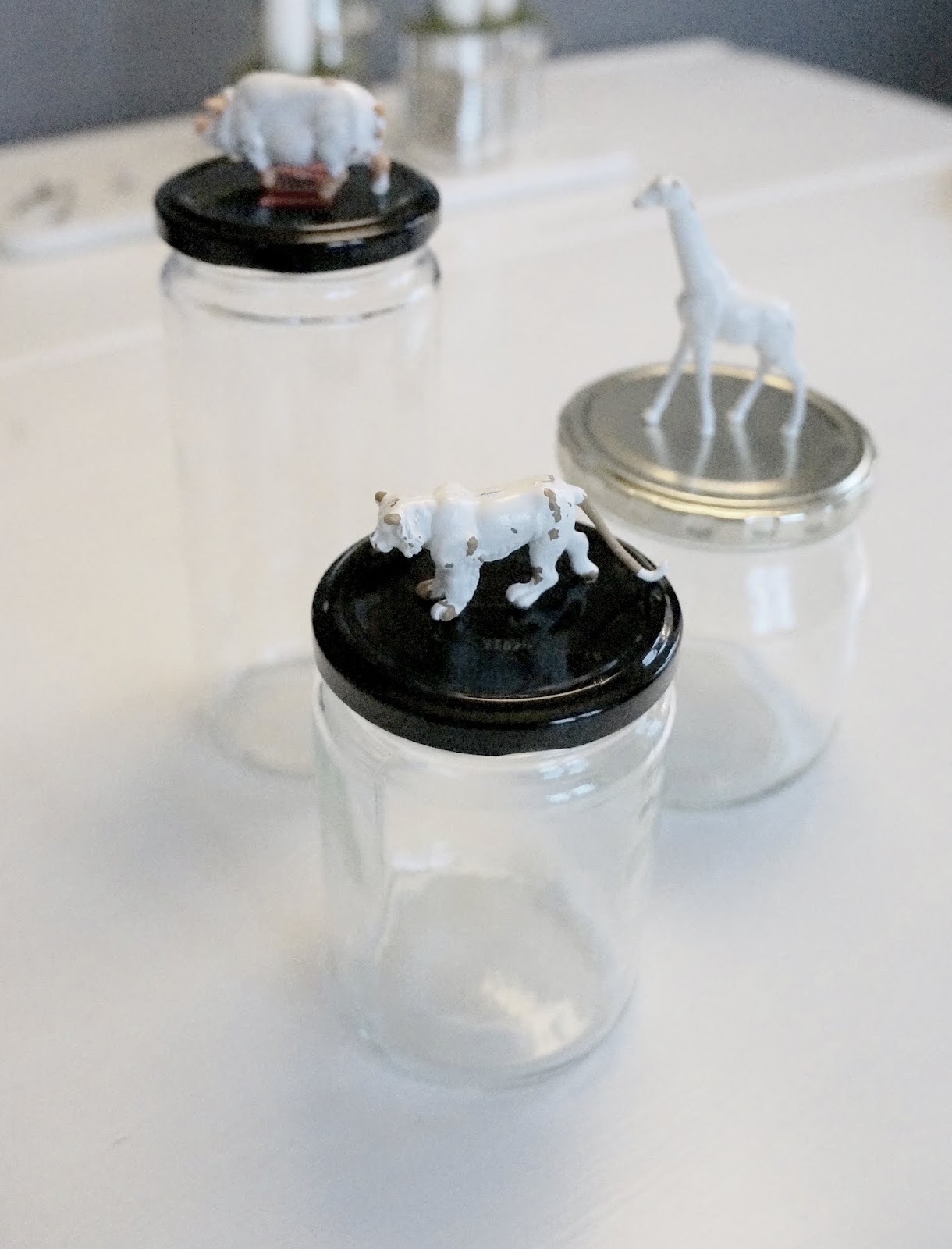 Jag tog några gamla urdiskade glasburkar i olika storlekar och limmade dit plastdjur på locket...